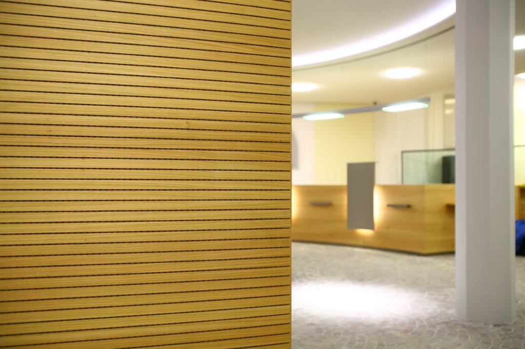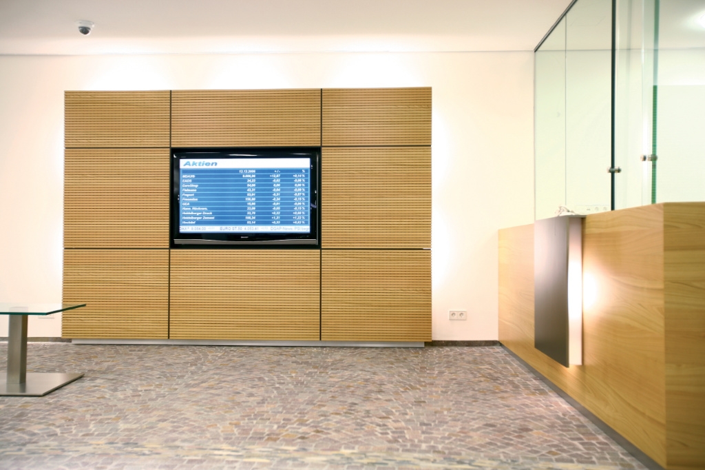Bank und Schalterhalle mit alternativem Konzept … ein integriertes Café mit kompakter Thekenanlage sorgen fuer zusaetzliche Kundenfrequenz. Einheimischer Kirschbaum und Pflastersteine als Bodenbelag sind charakteristisch fuer Region und Stadt … offen, kundenorientiert und einfach naeher dran. Becherer Moebelwerkstaetten – Partner fuer Ihren Erfolg.