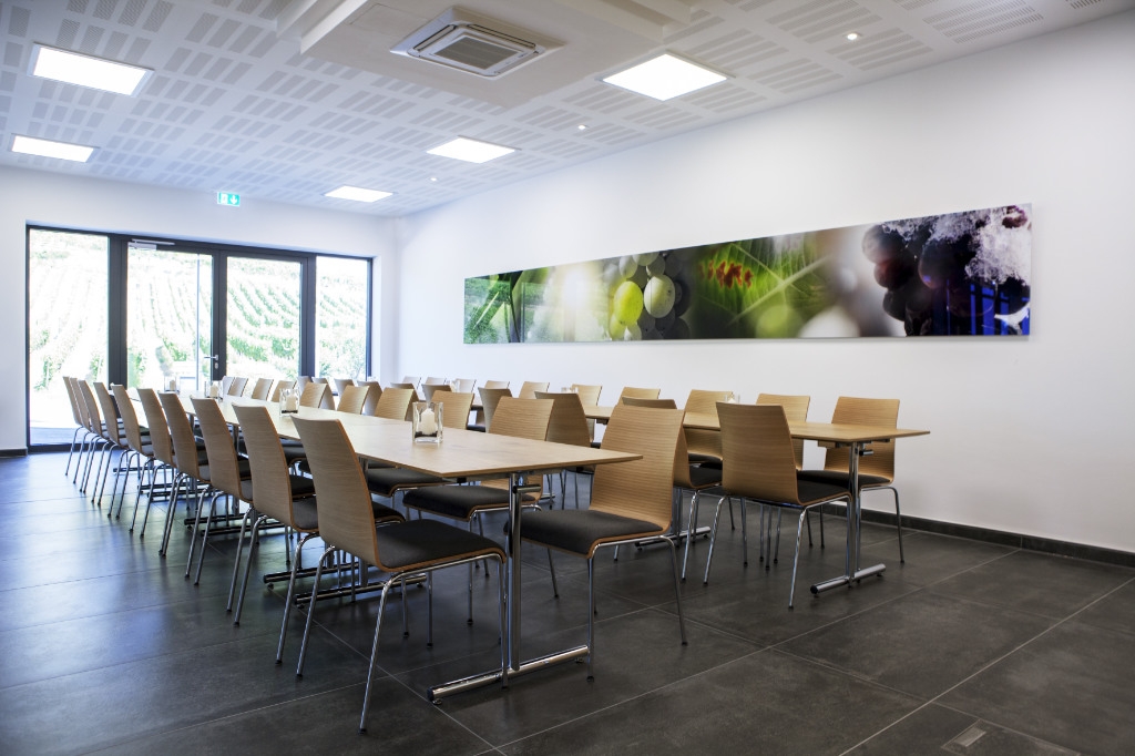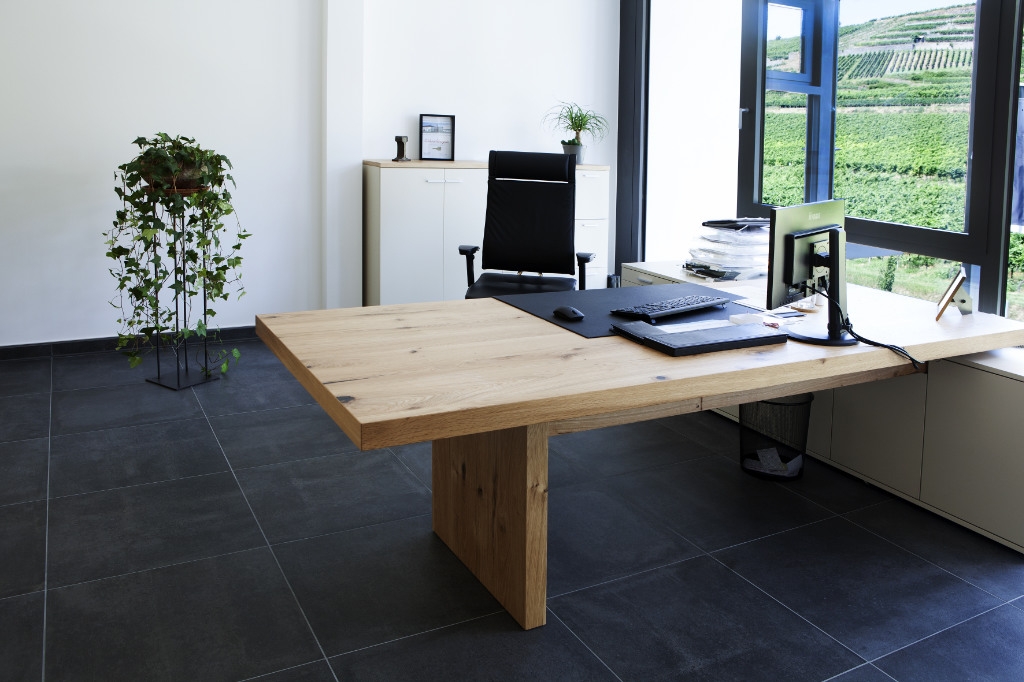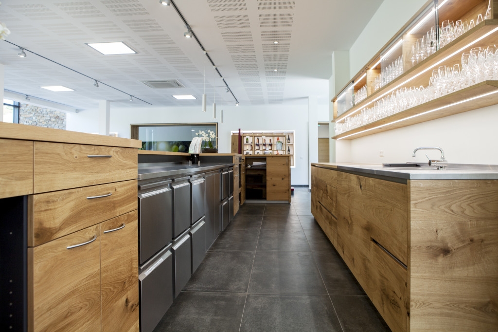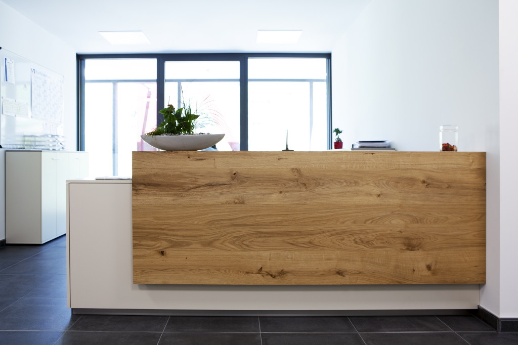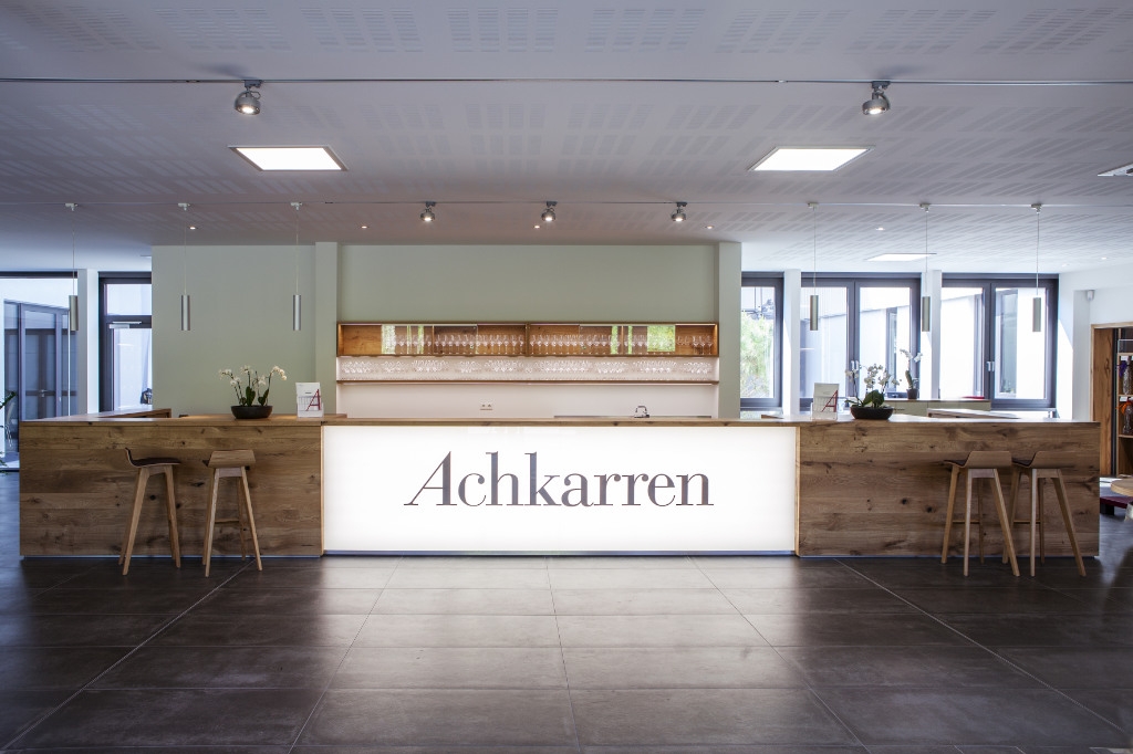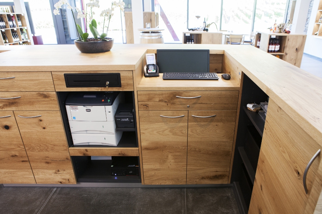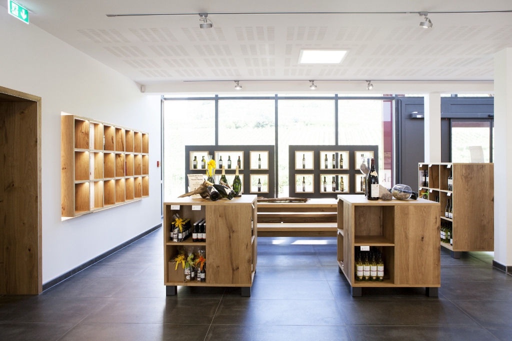 Weinkultur am Kaiserstuhl – Winzergenossenschaft Achkarren. Mittem im Kaiserstuhl, unterhalb des Hausbergs, dem Schloßberg, schmiegen sich zahlreiche kleine Winzerhoefe in die malerische Reblandschaft – das ist Achkarren, ein Kaiserstuehler Weindorf wie aus dem Bilderbuch. In enger Zusammenarbeit mit Architekt und Kunde entstanden fuer die neue Winzergenossenschaft offene und helle Raeumlichkeiten, welche das Weinerlebnis Achkarren auch optisch erlebbar machen. Funktionale und flexible Praesentationsmoebel, eine repraesentative Probier- und Verkaufstheke mit zwei integrierten, vollwertigen Arbeitsplaetzen und moderne Bueroarbeitsplaetze in heller und authentischer Eiche bilden dabei einen harmonischen und natuerlichen Kontrast zu der modernen Glasfassade. Unsere Leistung: Planung, Detailentwicklung, Fertigung und Montage. Becherer. Partner fuer Ihren Erfolg.